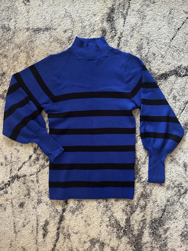 Цвет: насыщенный синий с черными горизонтальными полосами Материал: приятный к телу, хорошо тянется Рукава: объемные с зауженными манжетами – модный акцент, отличное состояние. Идеально подходит для осени, зимы и весны, отлично комбинируется с джинсами, брюками или юбками.