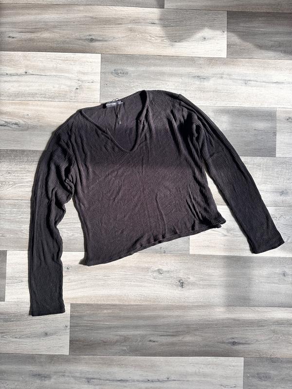 Лонгслив в рубчик, черного цвета, размер L-XL. Замеры: ширина в свободном состоянии 52 см, тянется до 70 грн, длина 51 см, длина рукава от шве 72 см. Ткань: 95% вискоза, 5% эластан. Имеет V-образный вырез.