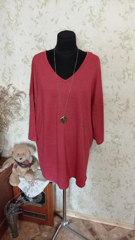 Ширина под мышками 64 см, ширина низ 64,5 см, длина от плеча 73,5 см, плечи приспущенные 68 см, рукав 29,5 см,по бокам разрезы.
