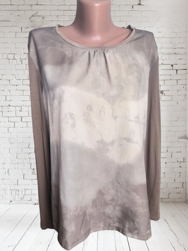 Лонгслив Betty Barclay. Размер 40 европейский (на L/XL). Стан идеален. Красивый бежевый цвет, спереди градиентные переходы. Рукава и спинка трикотажные, перед из нетягивающей ткани. Вискоза, полиэстер. Длина по спине 63, полу обхват груди 55, плечи 42