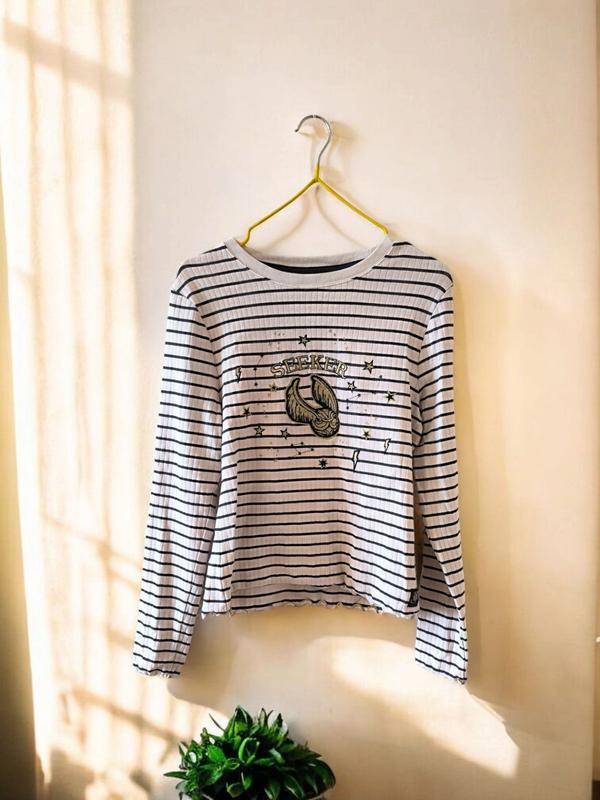Лонгслив в полоску с принтом. Стильный и уютный лонгслив для фанатов Гарри Поттера с принтом магического Золотого Снитча. Классическое сочетание бело-черной полоски делает вещь универсальной. Мягкая ткань приятная к телу. Отлично подойдет как для повседневных образов, так и для зажиточных домашних вечеров. Цвет: белый с черными полосками Принт: Золотий Снитч Размер: s Материал: мягкий трикотаж хорошее состояние. Замеры дамас по запросу Доставка по всей Украине 📦
