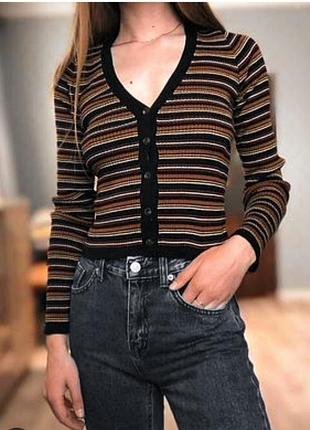 Кофточка в идеальном состоянии. Цвет немного темнее, чем на фото. Ткань трикотаж кофта н в рубчик, тем более хорошо тянется. Хлопок,вискоза,эластан. по груди тянется до полуширины 55 см Длина 50 рукав 63