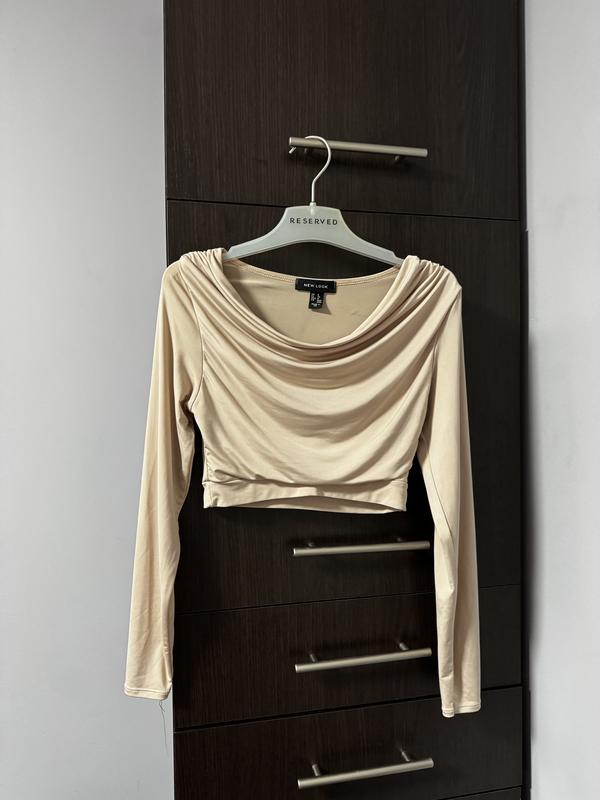 Жіночий кроп-топ із довгими рукавами у світло-бежевому (нюдовому) кольорі. Верх має драпірування в зоні декольте, що створює м’які складки. Тканина виглядає еластичною та м’якою, ймовірно, з домішками еластану. Бренд — New Look, розмір — UK 8 / EU 36 / US 4. Стиль виробу підходить як для повсякденних образів, так і для вечірніх виходів.