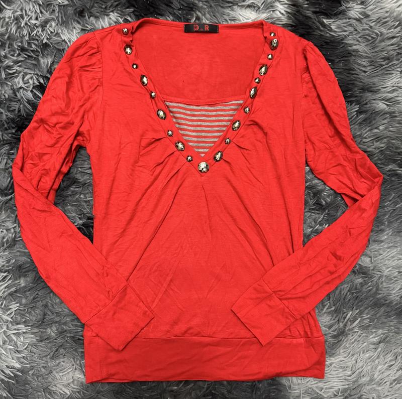 Нова базова червона кофтинка з імітацією майки понизу, пришиті камінці, добре тримаються, турецький виробник,розмір 42-46, стрейчева, легенька, гарно тягнеться, мʼяка та приємна до тіла, без бірок