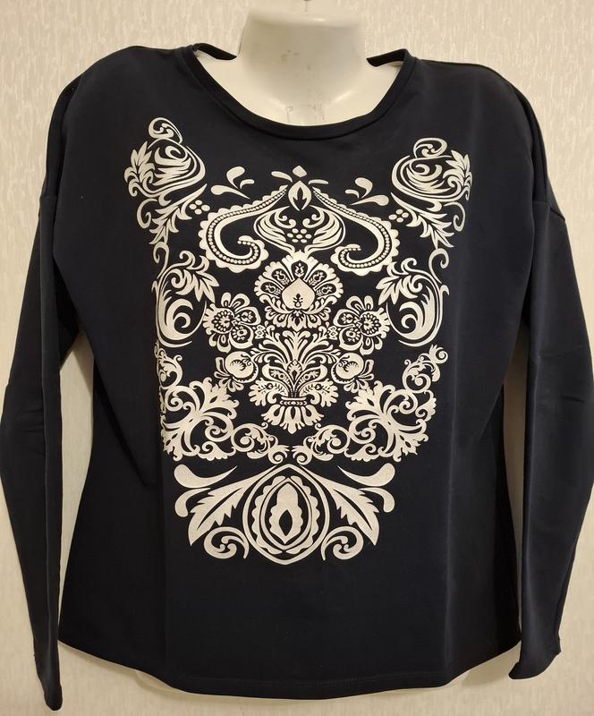 Лонгслив женский, качественный, темно-синий, с блеском (люрексовая нить) с белым принтом (абстракция) Размер: S/M.см.замеры Плечи-39 приспущени Пог-52 Пот-47 Поб-52 Длина-56/59 Рукав-45приспущен,,завужен. бавовна еластан люрекс