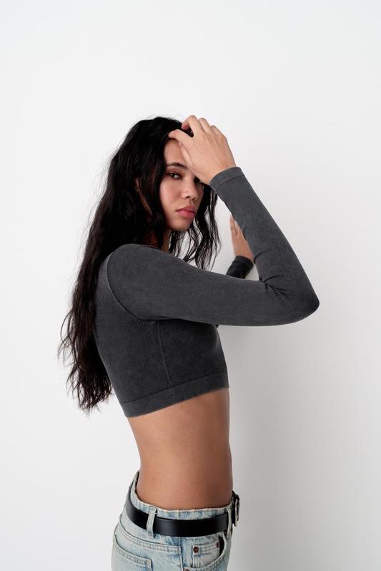 Сірий безшовний вкорочений лонг лонгслів в рубчик з вареним вивареним ефектом zara / бесшо...
