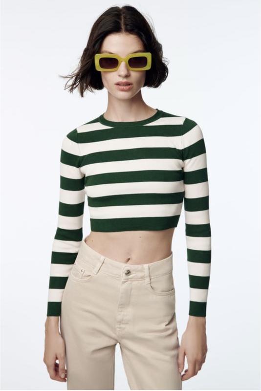 Лонгслів у смужку зелено-молочного кольору Розмір хс ( підійде на хс та с ) Пів обхват грудей - 32 см Довжина виробу - 38 см Довжина рукава - 55 см