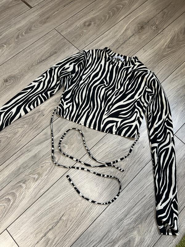 Лонгслів із зебровим принтом, розмір S Стильна кофта з яскравим зебровим принтом. Облягає фігуру, зручна та приємна до тіла. Внизу зав’язки — можна регулювати довжину. Стан чудовий, без плям і дефектів. Тканина приємна, не парить. Одягала один раз, Можливий самовивіз (Мукачево)