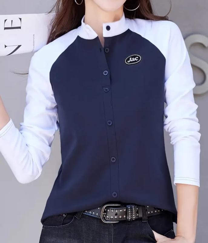 Женская повседневная рубашка на пуговицах с контрастными рукавами и стойкой - Темно-синяя и Белая с буквенным принтом, Среднеэластичная ткань.Весенний/Летний топ, на тонком флисе,размер s. Замеры: грудь - 94 см, длина - 62см