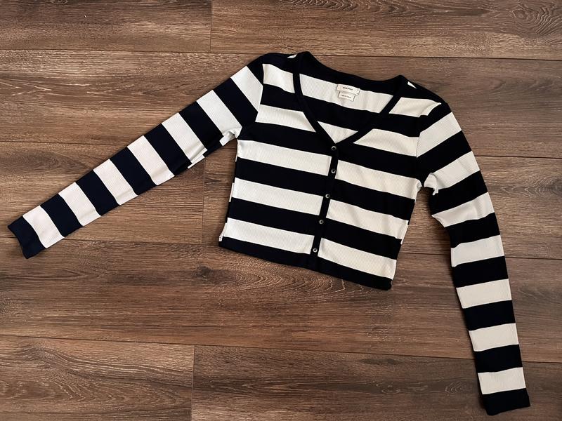 Лонгсліа у СИНЮ смужку, фото чомусь передає як чорну, але на живо він в синю смугу, розмір М, якісний, гарний, добре сяде на зріст 165-168. Заміри розміра в см є в фото.