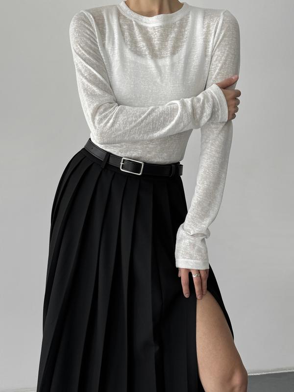 Полупрозрачный однотонный лонгслив белого цвета. Модель имеет длинные рукава и обработанную полукруглую горловину. Благодаря легкой текстуре и универсальному оттенку станет удачной базой для создания многих легких и многослойных образов.