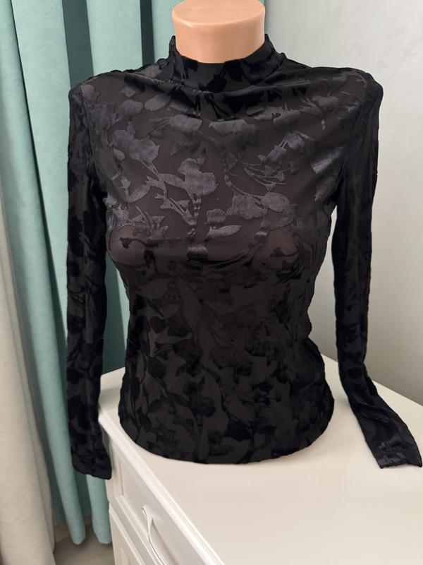 Лонгслів з квітковим візерунком, розмір XS–S 🌸 Фасон: Вільний крій 🎨 Принт: Суцільний квітковий візерунок 📐 Розмір: XS, добре тягнеться — підійде і на S • Довжина — 60 см • Рукав від шиї — 70 см • ПОГ (груди) — 38 см • ПОТ (талія) — 34 см • Низ — 38 см ✨ Деталі: • Низький напівгольф • Довгі приталені рукави • Еластичний, приємний до тіла матеріал 🧵 Склад: 46% поліамід, 38% поліімід, 16% еластан 🆕 Нова, без бірки. Гарно тягнеться, підкреслює фігуру