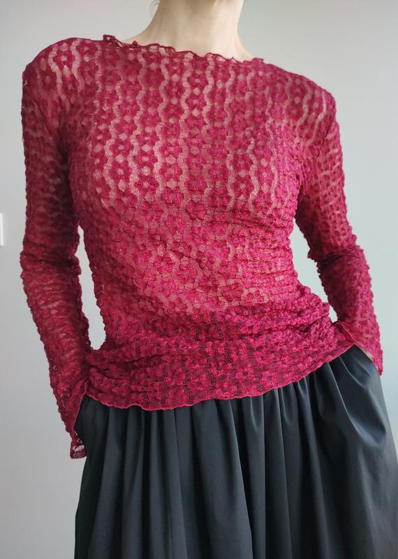 Лонг из эластичного кружева, цвет бургунди. Очень мягкий и приятный к телу. Длина - 55 см Длина рукава - 64 см Обхват груди - 44 см Ткань эластичная, поэтому размер универсальный, подойдет на с/м/л