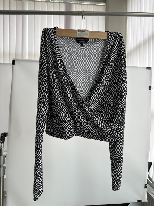 чорно білий короткий топ лонгслів блуза у клітинку з відкритим декольте