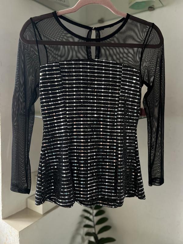 Лонгслів в паєдках , тканина еластична тягнеться, приталений , на грудях є чашечки , рукав в сіточку ,еластичний гарно прилягає до руки , можна носити без бюзгалтера , напівобʼєм грудей 47, довжина виробу 51, довжина рукава 55.