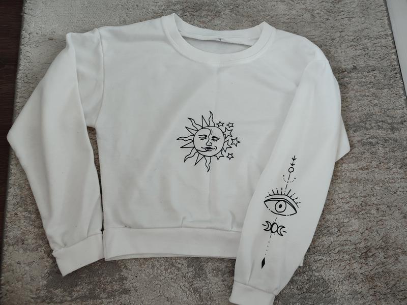ШИРИНА: 42 см ДЛЖИНА: от плеча 47 см ДЛЖЕННАЯ РУКАВА: НЕ от плеча 50 см худи укороченное белое с принтом на рукавах и посередине, оверсайз