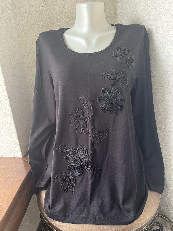 Розмір L Складник на фото Плечі-40 Пог-55 Пот-54 Поб-( низ)-58 Рукав від плеча-58 Довжина по спинці-63 Тканина приємна на дотик, еластична Тягнеться чудово. 📌Стан нового