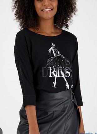 натуральный лонгслив от немецкого бренда престиж класса monari (в магазине цена 4000 грн), спереди украшен рисунком, аппликацией и стразами, рукав реглан 3/4, очень хорошая натуральная составляющая 45% вискоза, 45% модал, 10% эластан, размер 36, замеры на фото