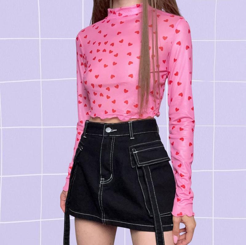 Новый короткий y2k лонгслив в сетку с сердечками