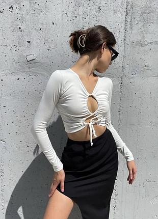 • укорочений фасон; • подовжені рукави; • спереду регульовані завʼязки (затягуй так сильно, як хочеш). • молочний колір; • тканина: джерсі (60% віскоза, 35% поліестер, 5% еластан).