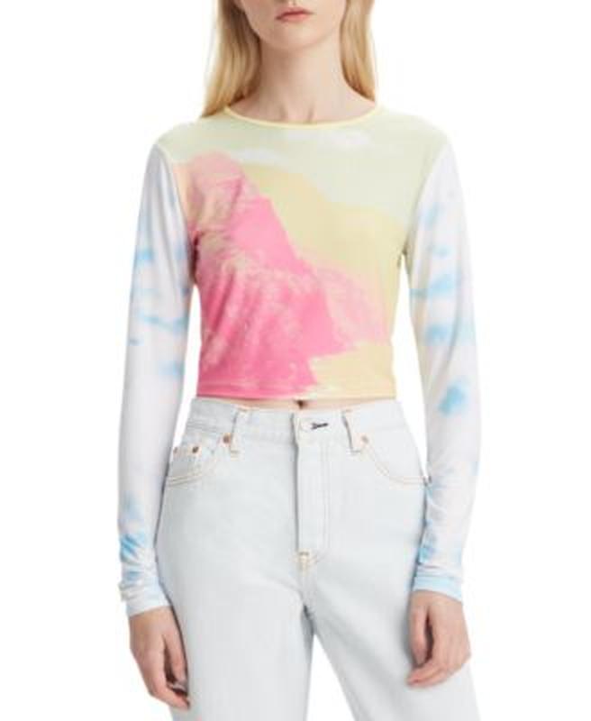 Модель - Levi's Women's Graphic Second Skin Slim Fit Crewneck Top Длина 42 см ширина плечей 36 см Полуобхват груди 40 см, тянется до 54 см полуобхват снизу 32 см, тянется до 45 см длина рукава от плеча 64 см ткань эластичная, приятная к телу цвет желтый с голубым, розовым Новый с этикеткой