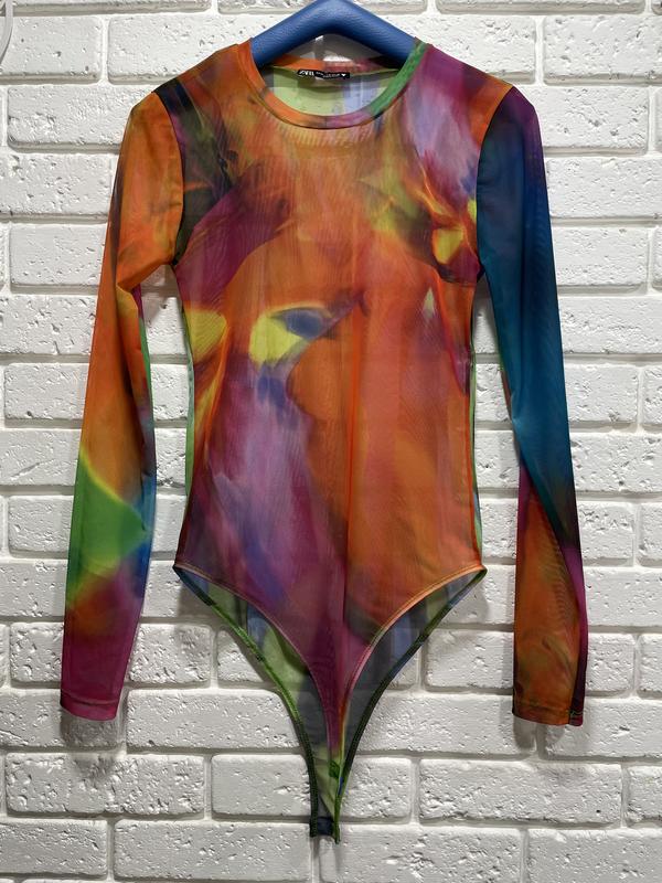 Яскраве боді від ,, Zara” в розмірі S,M. Плечі 34 см , рукав 63 см , п/ог 36 см , довжина по спинці до низу у застебнутому стані 75 см , заміри зроблені в спокійному стані тканини. Сітка тягнеться але тримає форму.