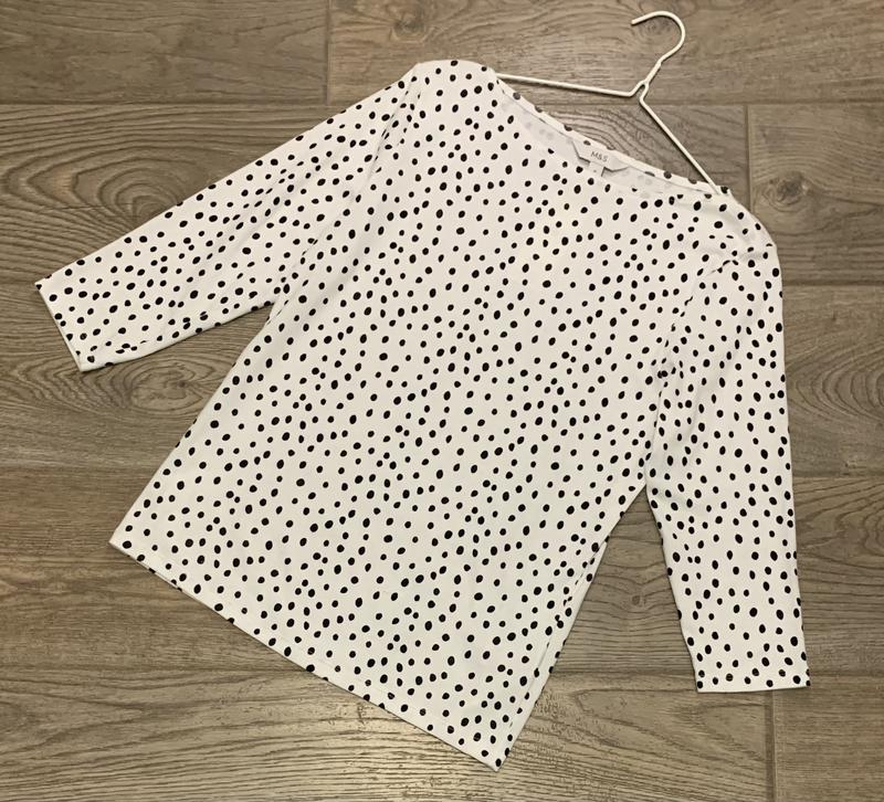Футболка/кофта Marks&Spencer р. 14/42/XL- підійде також на р. 12/40/L У наявності біла у чорну цяточку. 100% котон. ПОГ 47+ Плечі 40 Рукав 43 (три чверті) Довжина по спинці від плеча 62 k-21