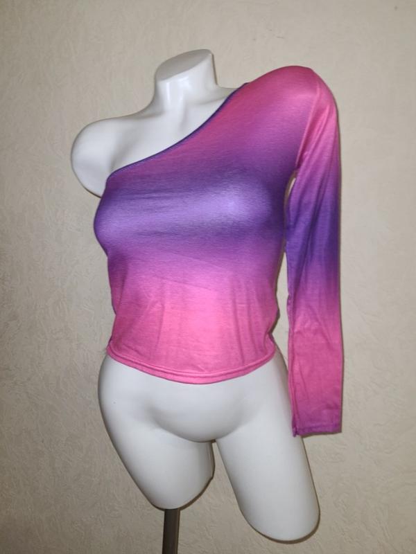 Яркий лонгслии на одно плечо, не ношен без этикетки. Подойдет. на размер 42-44