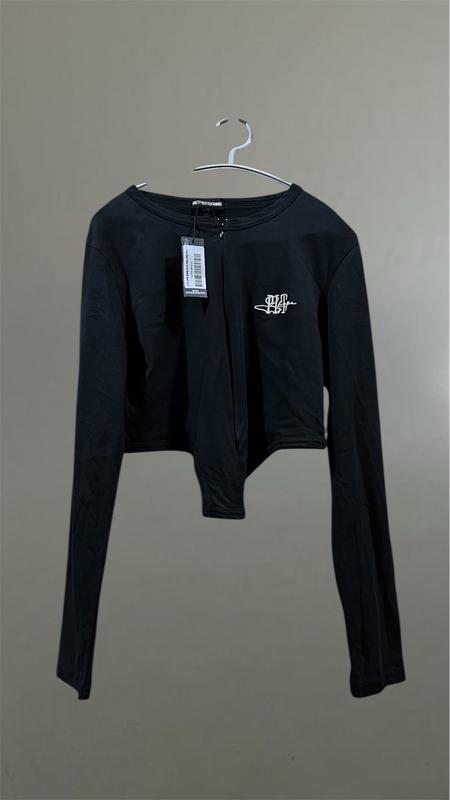 Жіноча кроп-кофта (лонгслів) Колір: Чорний Фасон: Облягаючий кроп (вкорочений) фасон з довгими рукавами Декор: Вишитий білий логотип PLT (PrettyLittleThing) зліва на грудях Горловина: Круглий виріз Матеріал: Ймовірно, бавовна з еластаном (судячи з текстури — еластична, приємна на дотик) Бренд: PrettyLittleThing Стан: Новий, з біркою