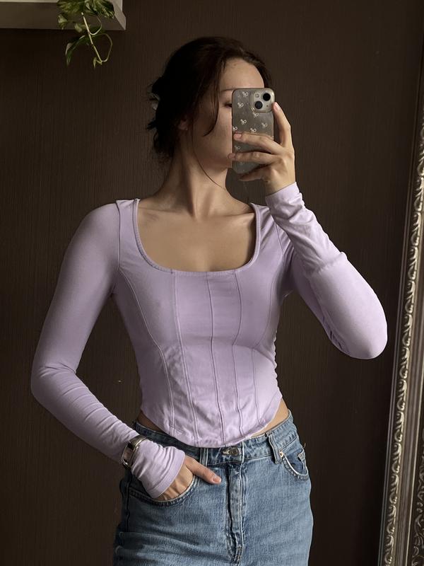 Лавандовий лонгслів з імітацією корсету з переду від New Look. 95% бавовна, 5% еластан. Розмір на бірці 36, але він добре тягнеться. Найкраще буде на xs-s На фото одягнено на зріст 175, ОГ 89, ОТ 74, ОБ 100 (впритик) Заміри: Між плечима 31 Під пахвами 35 Талія 31 По низу 31 Рукав 62 Пройма 17 Довжина по спинці 47