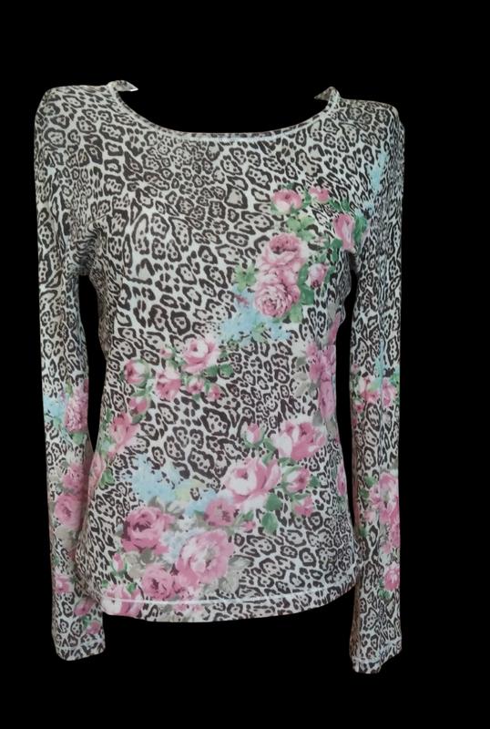 Брендовый лонгслив премиум класса. Леопардовый и цветочный принт. На эластичной подкладке. Бирка с составом срезана, но ткань на ощупь дорогая и качественная. Замеры:ПОГ-45, ткань хорошо тянется, еще+5 см; длина-56 см, рукава-60 см