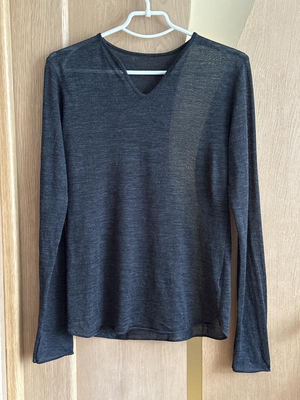 Жіночий лонгслів з тонкого, приємного на дотик трикотажу. Бірка зрізана, але за якістю та відчуттям тканини — це, ймовірно, натуральна вовна з домішкою шовку. Матеріал дуже м’який, легкий і водночас теплий, з ледь помітною напівпрозорістю. Має акуратний V-подібний виріз і довгий рукав. Ідеально сидить по фігурі, чудово поєднується як із класичними штанами чи спідницею, так і з джинсами. Підходить для створення витончених, базових або багатошарових образів. Стан відмінний, без пошкоджень. Розмір: орієнтовно S–M (тканина добре тягнеться).