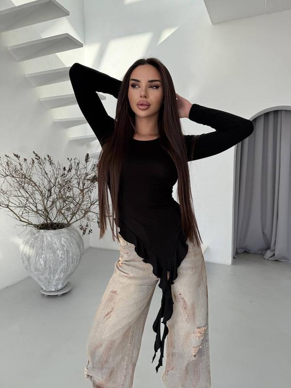 Лонгслів, що додає елегантності кожному образу 🤍 Незвичний асиметричний крій із рюшами та драпіруванням створює стильний акцент і робить річ особливою. Легка віскоза дарує комфорт і ніжно облягає фігуру. 🤍 Розміри: 42/44, 46/48 🤍 Тканина: віскоза 🤍 Кольори: білий, шоколад, чорний Ідеальний вибір для стильних луків як на кожен день, так і для особливих виходів ✨