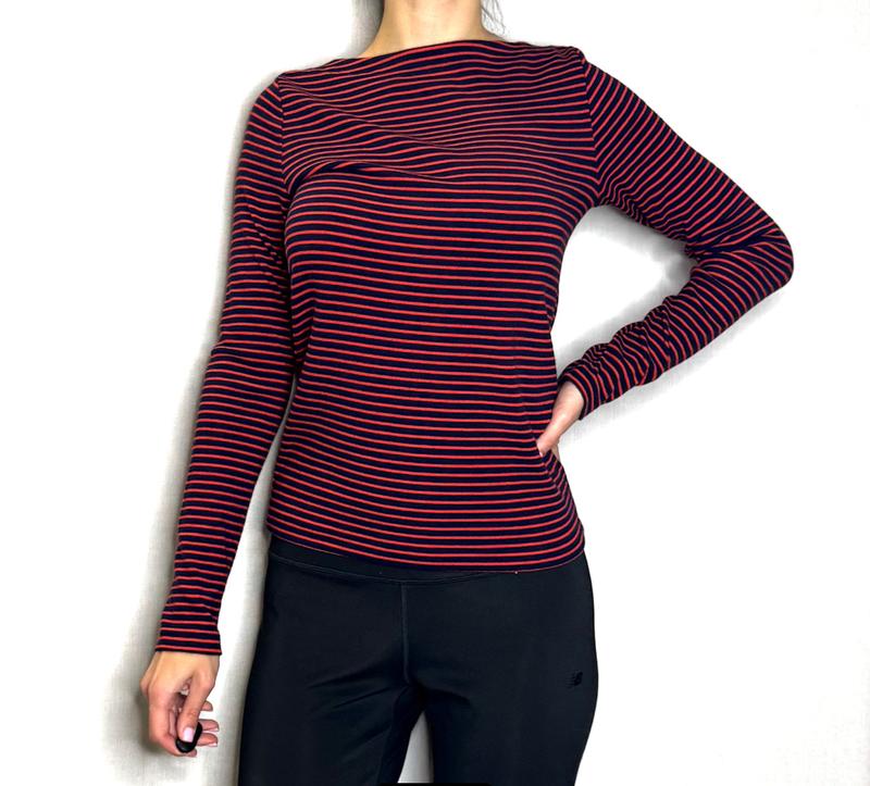 Дуже мʼякий неймовірно приємний до тіла лонгслів. Досить теплий але при цьому не товста тканина Виріз лодочка, в смужку. Стан нового, без нюансів. Розмір М - заміри на фото