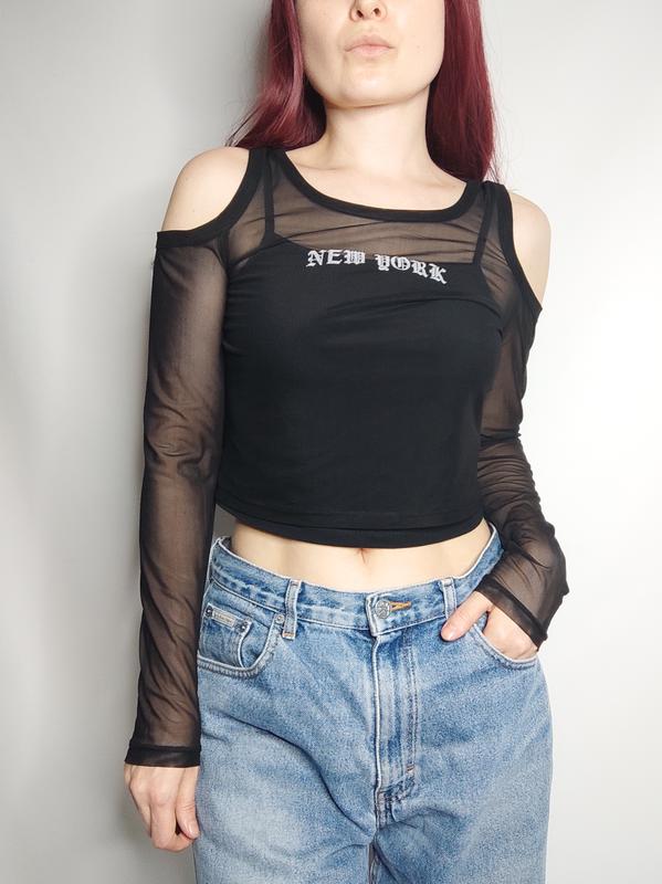 Черный лонгслив, поддвойной, майка+сеточка. По наборке 12-13 лет - хорошо садится на xxs- xs. ▪️ ЗАМІРИ: длина 41 см ог 80-86 см от 70 см ▪️94% поліестер 6% еластан/ 96% бавовна 4% еластан