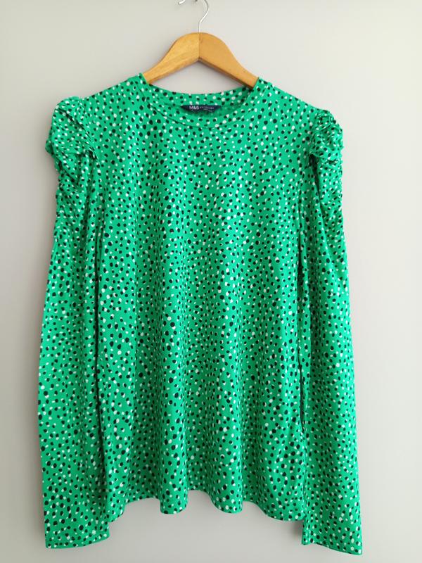 Лонгслив от Marks and Spencer, состояние идеальное, без дефектов, 100% вискоза, размер указан 10. Длина 64 см, полуобхват груди 48 см, плечи 36 см, рукав 65 см.