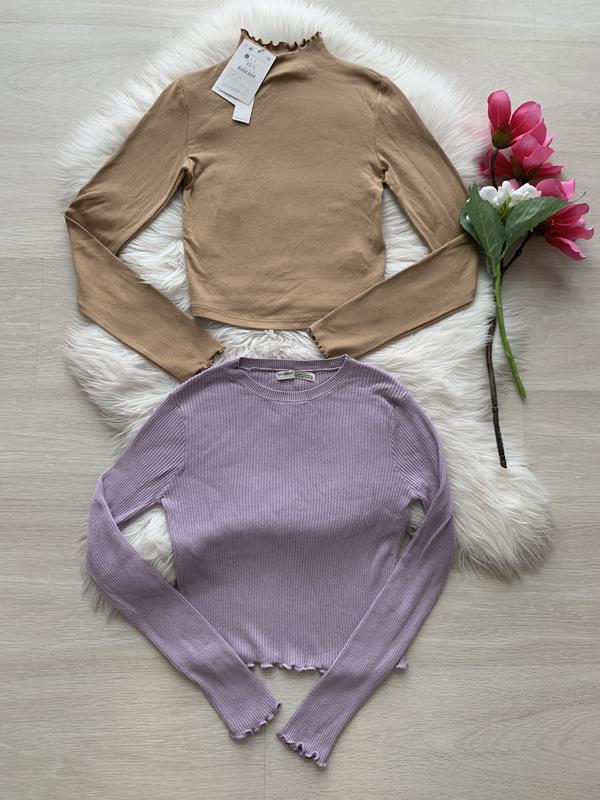 Сет із двох лонгслівів з довгим рукавом: один бежевий, другий лілового кольору. М’які, приємні до тіла та еластичні — комфортно сідають по фігурі й підходять для щоденних образів. Лонгсліви легко поєднуються з джинсами, брюками, спідницями та підходять як базовий шар у холодну погоду. Стан чудовий, без дефектів. Ідеальний базовий комплект для гардеробу.