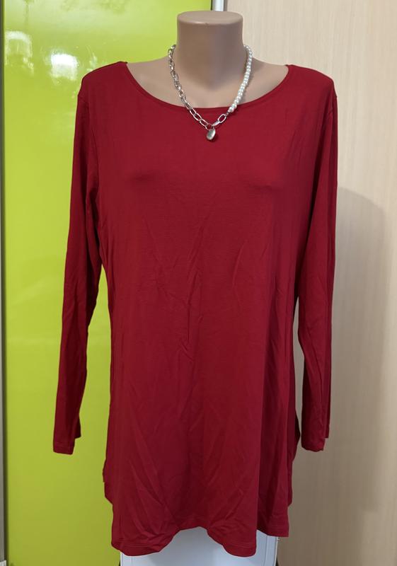 Подовжений лонгслів ( як туніка). В гарному стані, без нюансів, приємна тканина, склад нажаль не вказаний. Доволі еластична. Має розрізати по боках. Глибокий червоний колір ( більше мабуть винний). Штучна і практична річ, можна використовувати як на кожен день з лосинами, так і для тренувань. Заміри Пів обхват грудей 57см ( та тягнеться) Пів обхват талії 53-54 см та тягнеться Низ пів обхват 60см та тягнеться Довжина рукава від горловини 70см Довжина виробу по спинці 82см