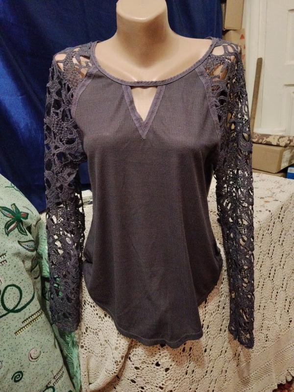 очень красивый топ с прозрачными ажурными рукавами.Сзади на запах.Ткань не теплая, хорошо тянется.Размер м,л,хл. опис состояние отлочный длина 64 рукав 62 ширина комди 50