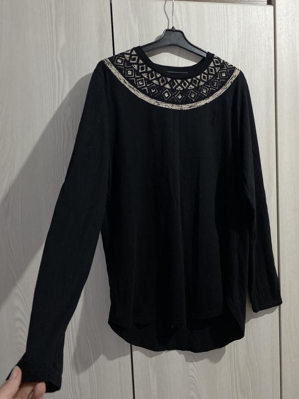 Жіноча кофта з декоративним принтом Розмір Л 100% котон Заміри Довжина по спині 80 см Довжина спереду 66 см Ширина плечей 44 см Об грудей 86 см Об талії 102 см Об бердра 105 см Довжина рукава 68 см