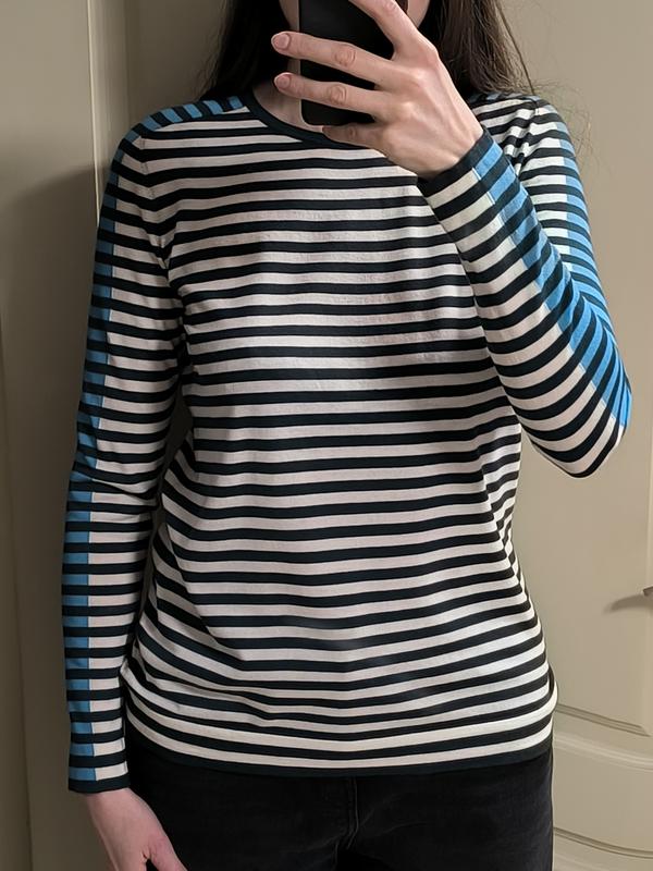 преміум бренд,вовна 100%,не коле.є ледь помітний слід від носіння під пахвами,аж глибоко.Та зашита зачіпка по зеленій смужці по пілочці.