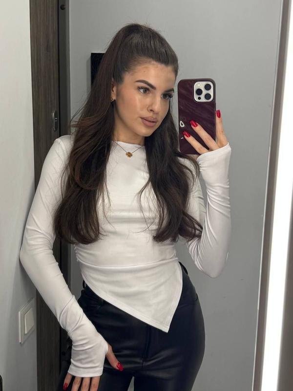 Модный асимметричный лонгслив, который подойдет к любому образу. На рукавах есть вырезы для пальчиков. Модель 3098 Размеры : 42-44, 46-48 Тканина - микро дайвинг (Турция)Люкс качество Цвета: черный, электрик, беж, белый, Бордо Замеры 💛Обхват груди (42-44)-76см (46-48)-82см 💛Обхват талии (42-44)-56см (46-48)-62см 💛Длина 41-60см 💛Рукав (42-44)-70см,(46-48)-71см