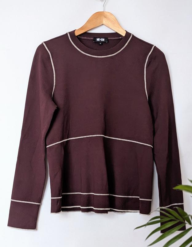 Лонгслив с светлой контрастной строчкой по горловине, швов на рукавах и линии баски, подчеркивающий ее крой. Длина от плеча 59см Объем груди полуобхват 46-49см Рукав от плеча 63см Плечи 37,5см