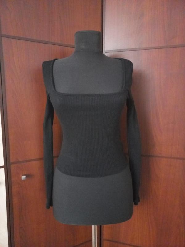 черный лонгслив в рубчик с глубоким вырезом. Размер указан M, но маломерит, поэтому ориентируйтесь на замеры. Длина 46 см, длина рукава 62 см, ширина плеч 29 см, ширина 28 см, ткань тянется.