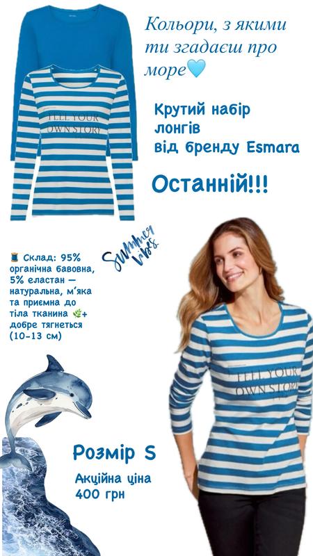 ✨ Набір із двох лонгслівів Esmara, які нагадують тобі про море🌊🐬 🎨 Кольори: стильні базові відтінки, які легко поєднуються з будь-яким гардеробом 👌 Лонги добре тягнуться, сідають Розмір S 🧵 Склад: 95% органічна бавовна, 5% еластан🌿