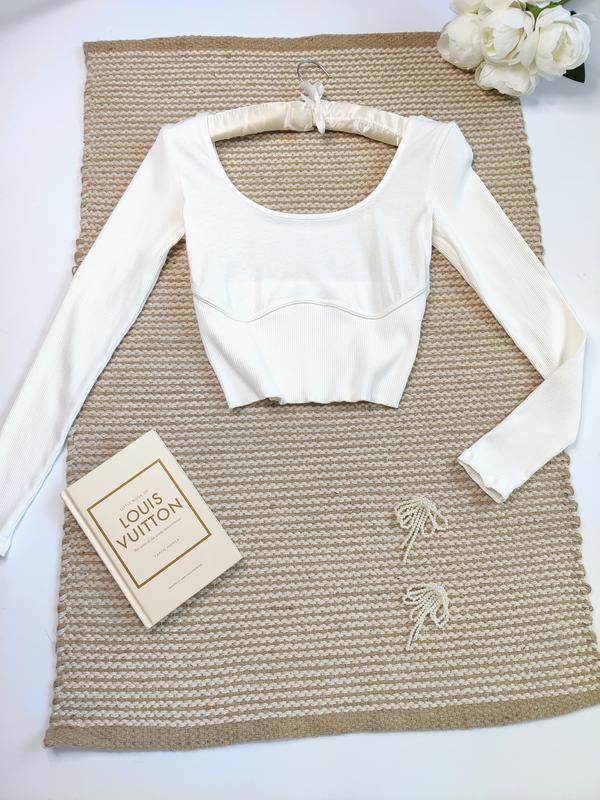 Базовый лонгслив в белом цвете. Натуральная, котоновая ткань. Идеально садится по фигуре. Размер Xs-S. Фото реальное, сделано мной. Замеры: на грудь 80-86 см., длина - 40 см.