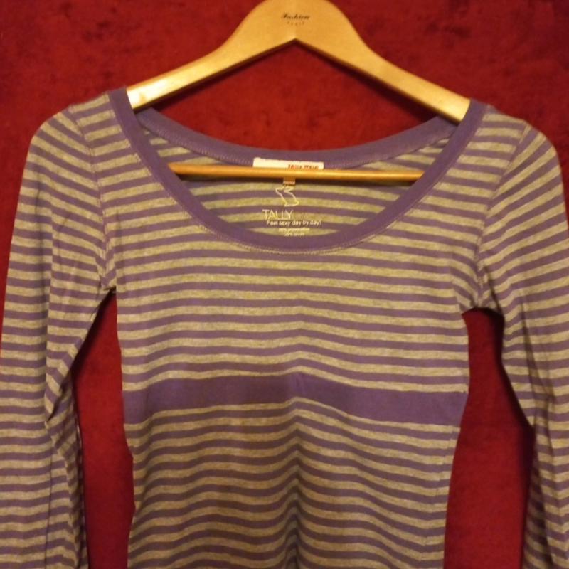 Лонгслив фиолетовый в полоски, большой вырез. По низу есть дефект (на фото).