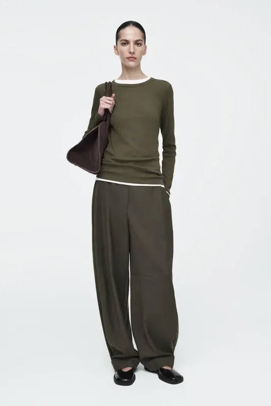 S 165/ 88 A Цей універсальний топ в рубчик кольору хакі виготовлений з м’якого еластичного трикотажу з органічної бавовни, має класичний круглий виріз горловини та довгі рукави. Відкритий шов з накладкою проходить вздовж спинки для акуратного вигляду. Склад: 97% органічна бавовна, 3% еластан. Звичайний крій ➡️ S: - плечі 36 - ширина під рукавами 40 - довжина 65