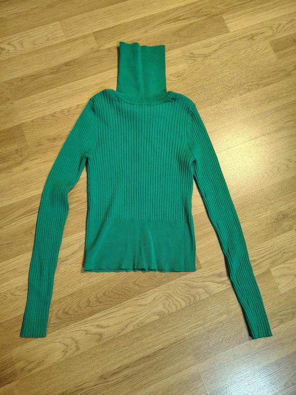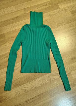 женский лонгслив Zara в размере S в зеленом цвете.Укороченная модель.Ткань трикотаж в рубчик, красиво тянется.Размеры: плечи 35см, рукав 62см,груды 40, длина 49см.Высокая горло устойчивая стойка, которое можно подвернуть.