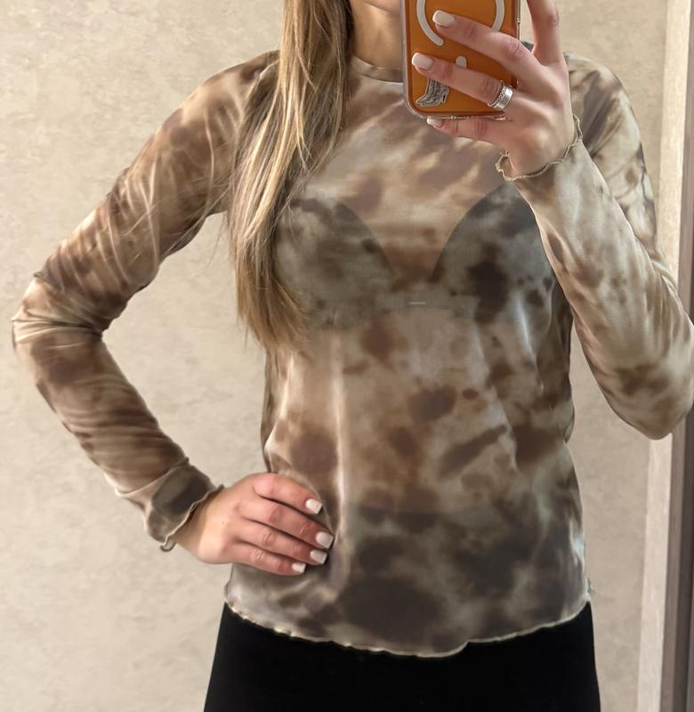 Стильний жіночий лонгслів від Primark & Бренд: Primark • Розмір: 12-13 років (підійде на XS-S, орієнтуйтесь на заміри) * Стан: ідеальний Модний напівпрозорий лонгслів у трендовому принті тай-дай в кори-чнево-бежевих відтінках Тканина легка, еластична, приємна до тіла. Гарно сідає по фігурі, підкреслює силует. Ідеально поєднується з джинсами, шкіряними штанами або спідницею. Чудовий варіант як самостійно, так і під жакет чи жилет